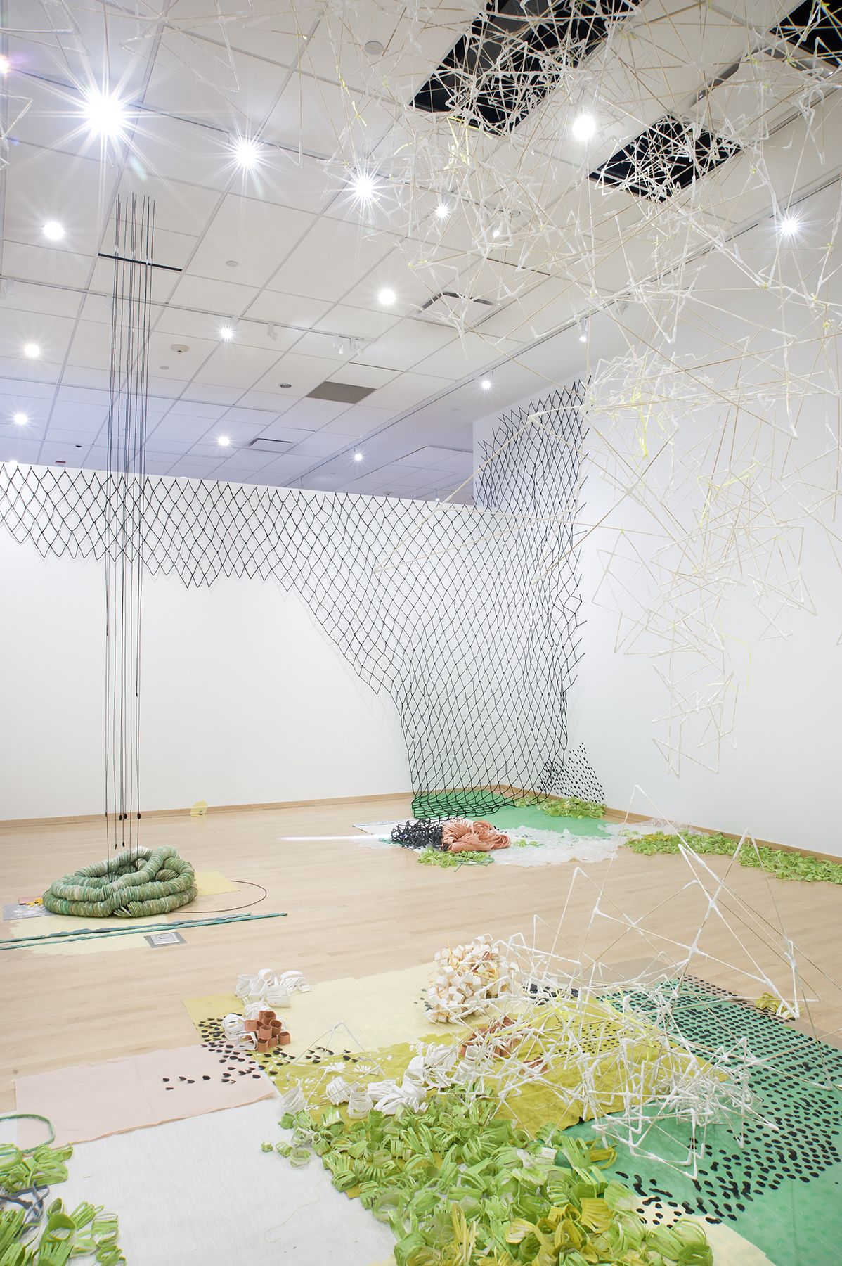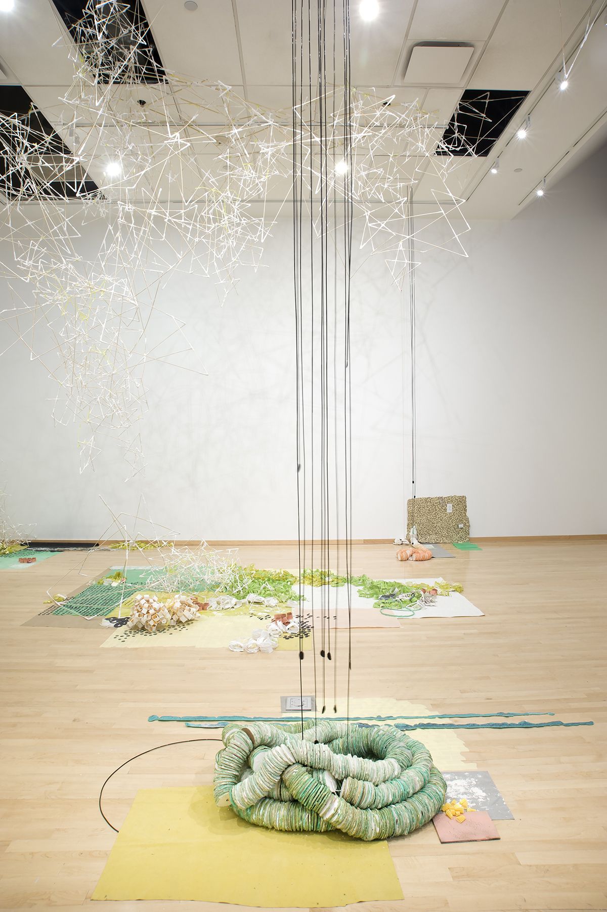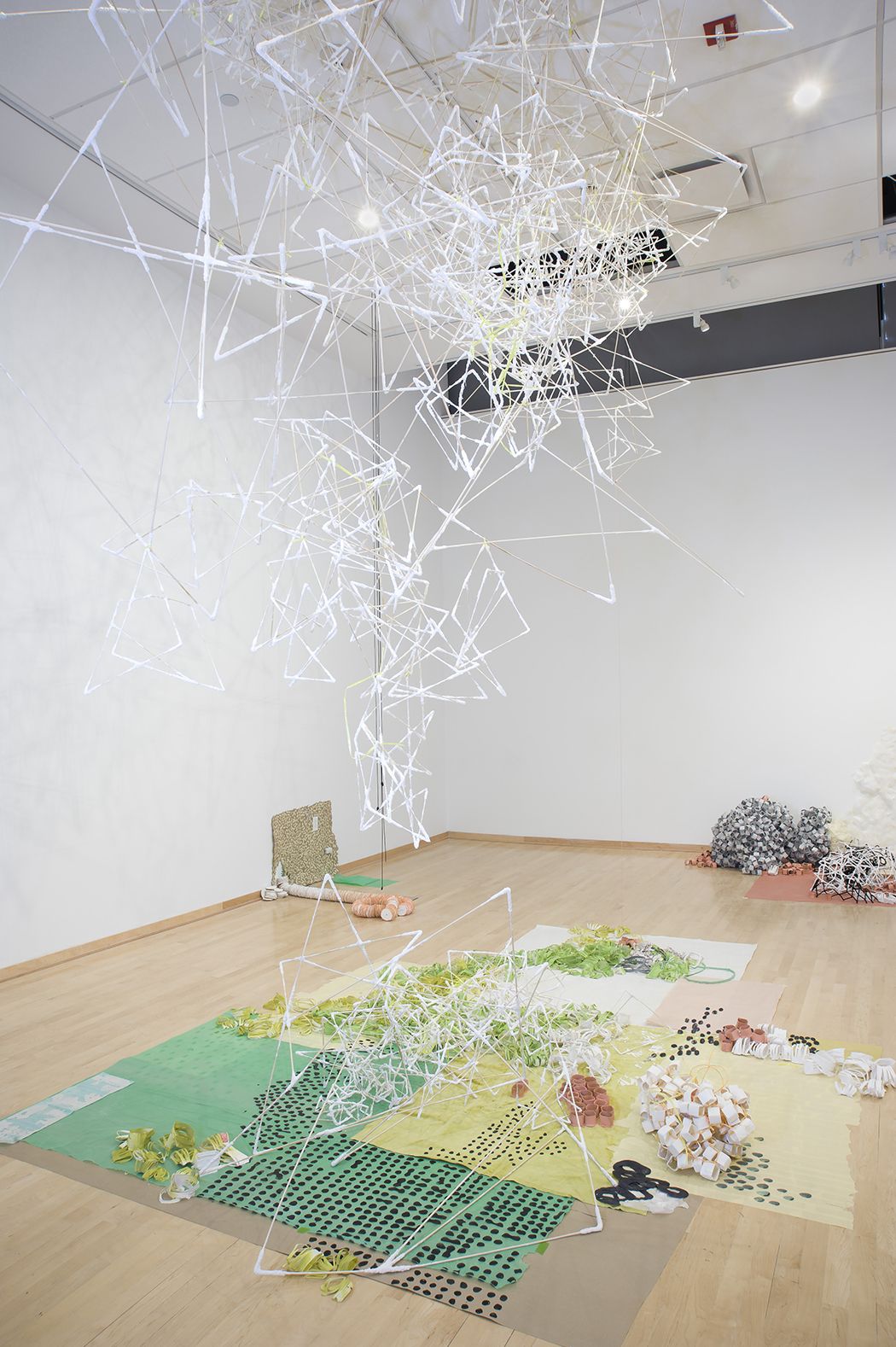 For the past two years I have switched gears, moving away from embroidery and trying some new ways of making. Still thinking of my work as an attempt to draw in space, I have been making installations and objects by folding, cutting, coating and stacking different types of materials.  I’ve been thinking a lot about the space of the studio and how it becomes a place of improvisation, testing, and questions. I am simultaneously making and unmaking in my constant rearrangement of objects and materials. Through incorporating elements that have a range of my intervention at different states of completion in this installation, I’m looking to disrupt the illusion of the final polished artwork, leaving room for possibility.