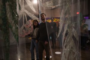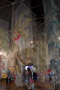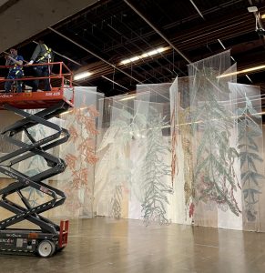For this exhibition, I installed part of my work Ode to a Prairie, which consists of large panels featuring printed embroideries. What made this installation unique was the approach: rather than suspending the panels overhead as I typically do, the pieces were hung to extend almost to the floor, creating a pathway down the middle that allows visitors to walk through the work itself. Instead of looking up at a field hovering above, visitors find themselves surrounded—immersed within the piece. The panels create walls of flora on either side of the path, enveloping viewers in embroidered prairie plants. You don’t just observe the work from outside; you enter it, move through it, and experience it from within.
