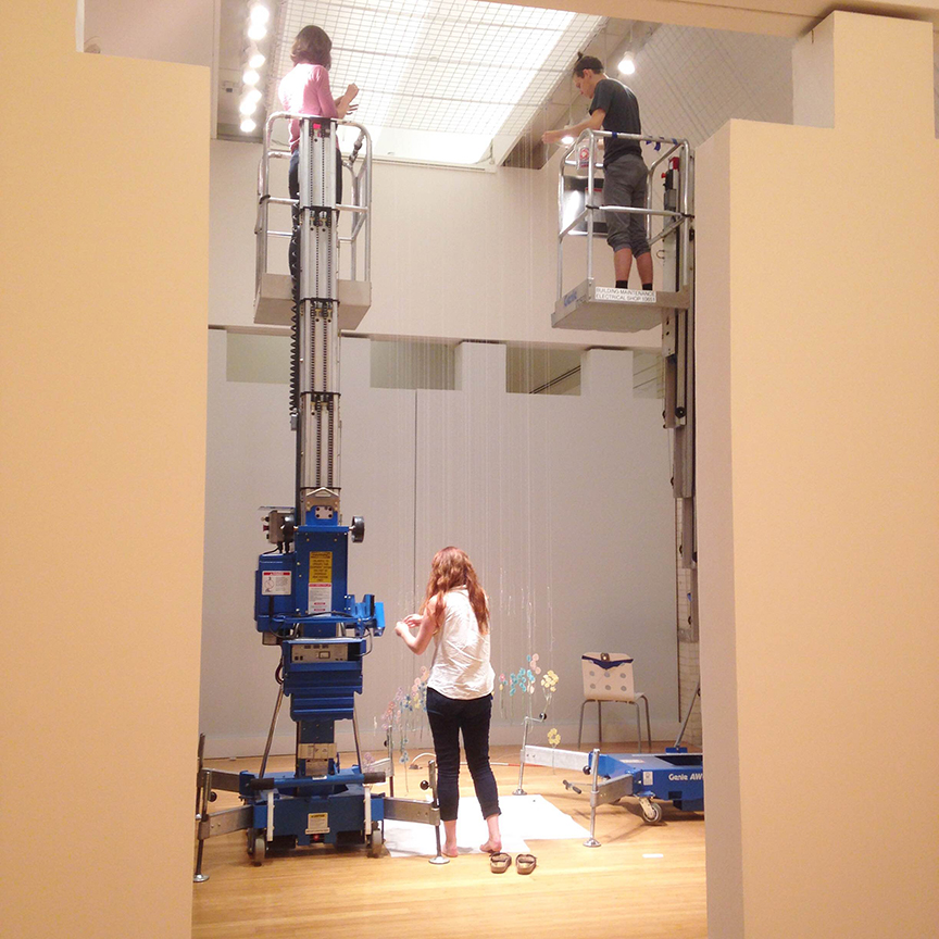 This week was spent installing two large installations at the Virginia Muesum of Contemporary art in Virginia Beach.  Floating Garden was installed in a room that we painted a pale grey to reference the cool blue of outdoor light.  It took us 3 days to install all 600 flowers from individual strings on lifts because the ceilings are so high.  In a second room painted a light yellow colour to mimic indoor light, we installed my newest room installation titled Living Room 2 that I have been working on for the past year.