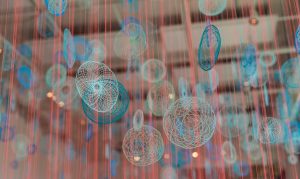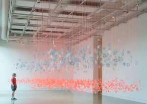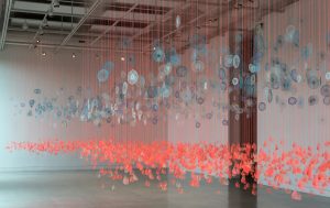 “Pink Field, Blue Fog” begins with the space of the garden and the artifice of silk flowers, transforming these ideas into an immersive landscape of color and light. Thousands of embroidered pieces suspend from single threads, creating an abstracted field of flowers beneath a hovering cloud. The installation invites viewers to move through pathways winding between vivid neon pinks and blues, experiencing the work from multiple perspectives—walking among the suspended blooms or lying beneath them to look up through layers of glowing color.
