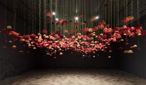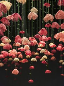 Poppies explores the fleeting nature of this emblematic flower by rendering and preserving the moment of the poppy in bloom through thread. This installation invites viewers to walk underneath a suspended poppy field, shifting the traditional perspective of a garden and creating a surreal moment suspended in time. The work engages the multiple associations and symbolism of poppies—from sleep and healing to remembrance and death—while also referencing the repeat patterning found on floral fabrics and wallpapers. What began as a commission of one hundred flowers, hanging and photographed to commemorate the centenary of the First World War’s end, has expanded into hundreds of embroidered poppies hung upside down from the ceiling, creating a dreamlike environment where these delicate forms become keepsakes, memories, and tender reminders of life, time, and space.