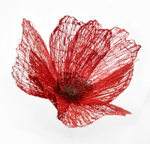 The poppy has long captivated gardeners with its colourful varieties and showy blossoms, yet it carries deeper cultural weight as a symbol laden with meaning. One can imagine cheerfully frolicking through these poppies or pausing to commemorate a fallen warrior; perhaps even lying on the floor and looking up at this lush meadow will cause one to drift into slumber—after all, poppies loomed large in the Land of Oz. This mysterious field is not created to unsettle but to draw viewers in, spark curiosity, and encourage engagement. The diaphanous installation skillfully plays with associations of duality, presenting an alternative perspective to both drawing and embroidery—where delicate thread structures capture the ephemeral beauty of blooms that exist only briefly in nature, now preserved and monumentalized in a floating garden that invites contemplation of beauty, loss, and remembrance.